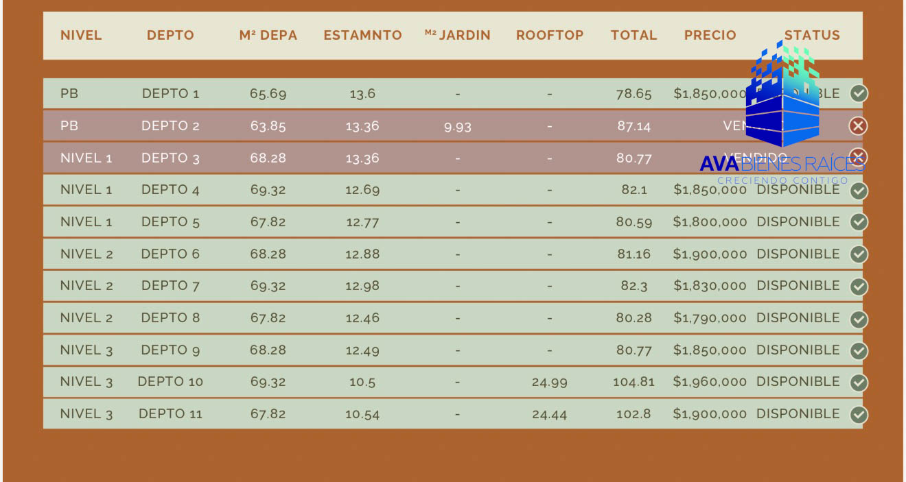 Los departamentos cuentan con dos recámaras, dos baños completos, cocina integral, sala, comedor, área de lavado, cisterna de 3 mil litros independiente por departamento abajo de su cajon de estacionamiento. También incorpora cámaras de vigilancia, interfon por departamento y gas estacionario.
