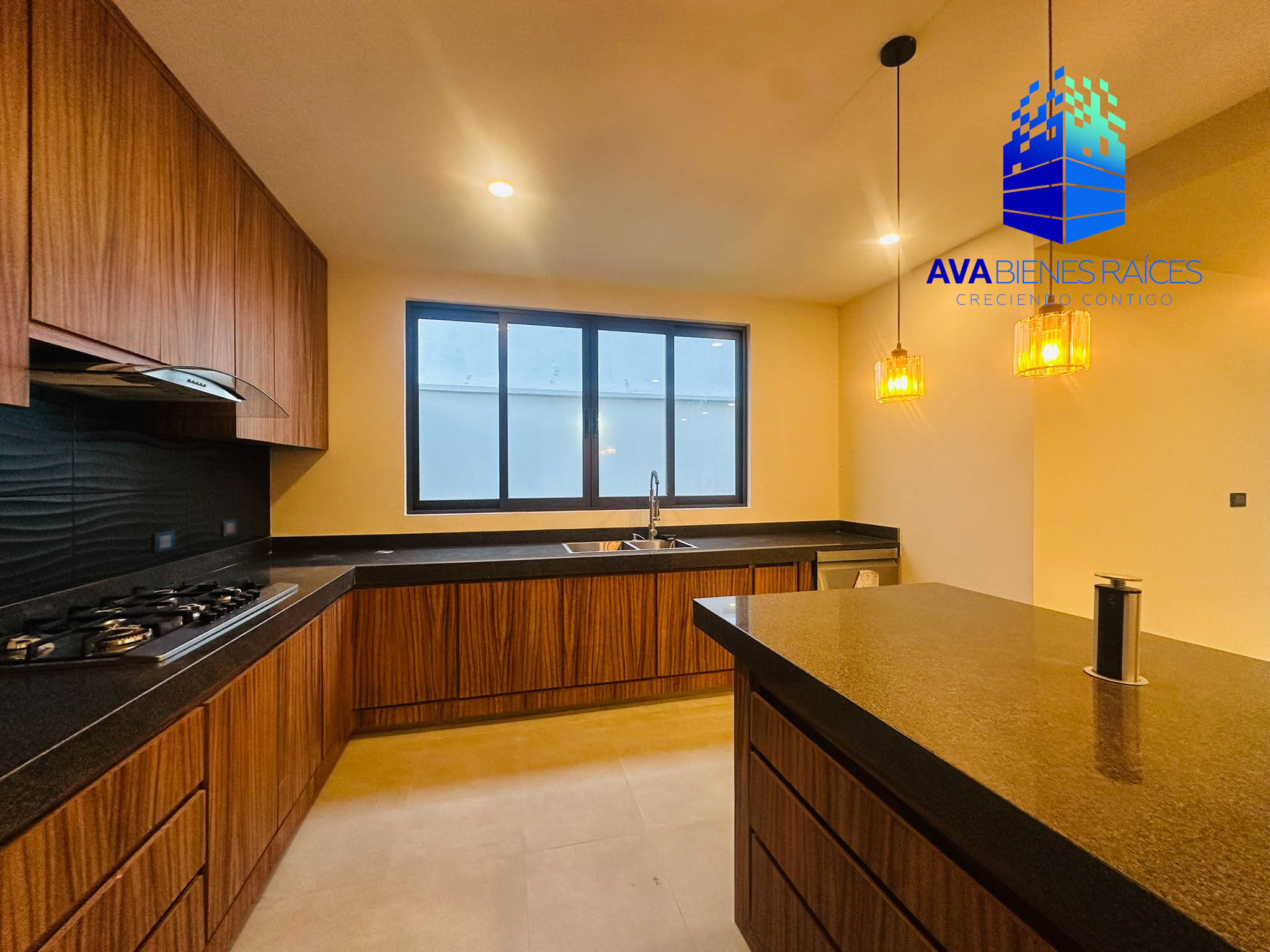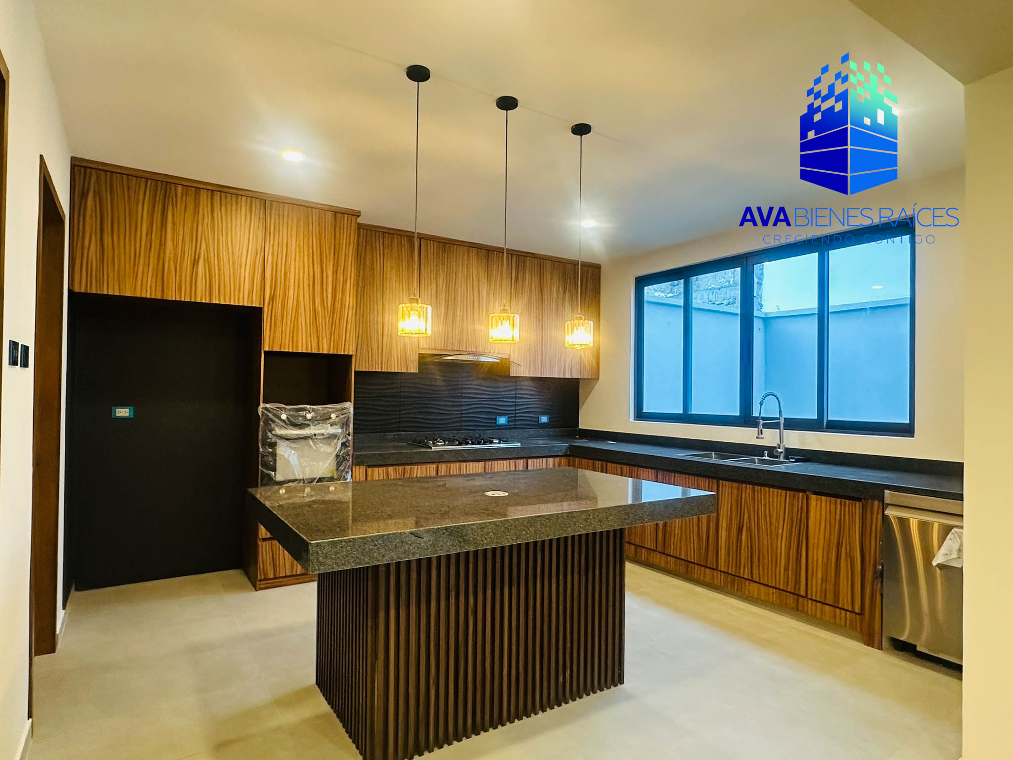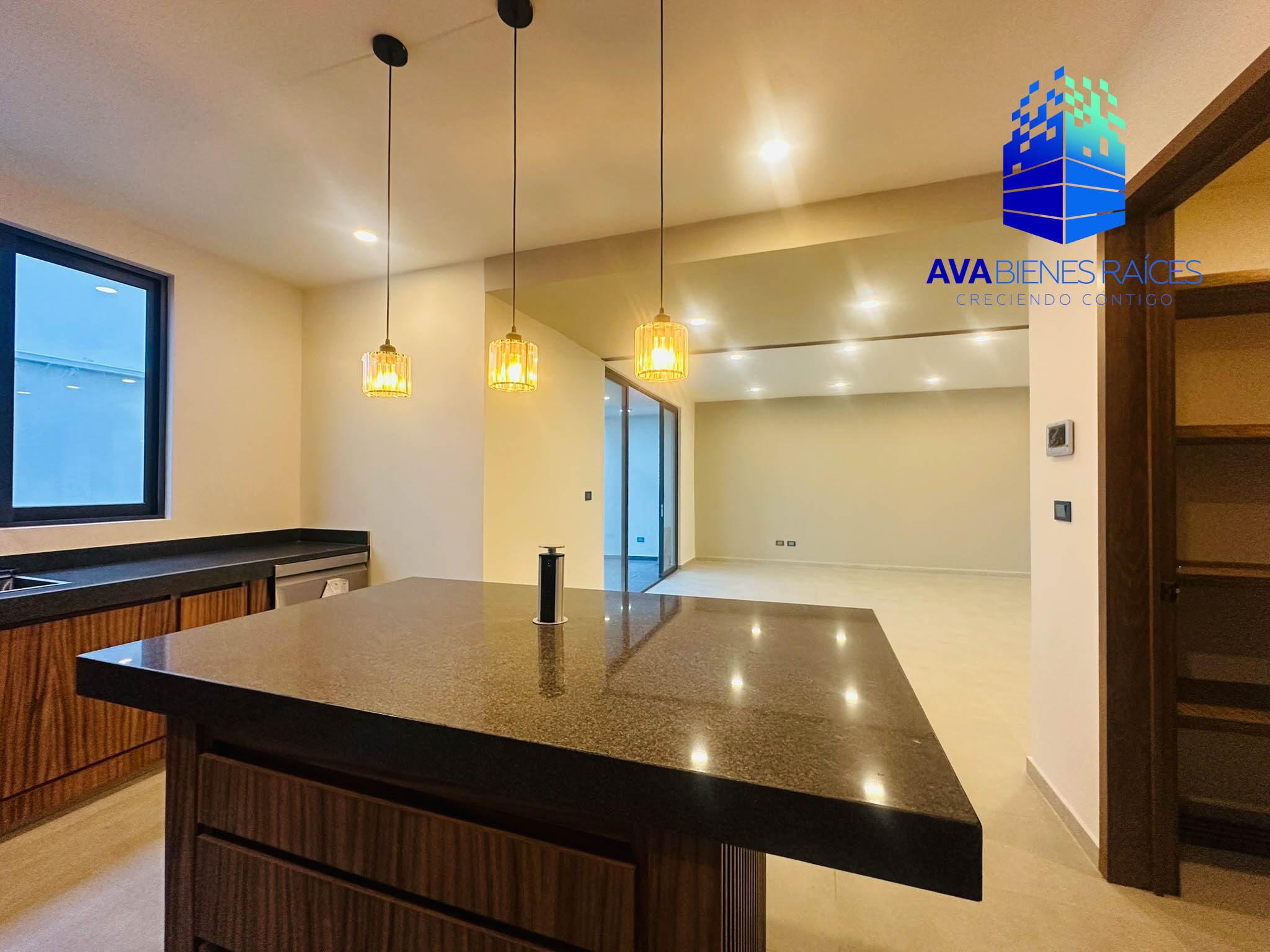 Planta baja: cochera techada para 2 autos, sala/comedor, área de guardado en sala, cocina integral con barra de granito (equipada con horno, parrila, camapana y lavavajillas), isla, alacena, área de lavado y tendido junto a cocina, pasillo de servicio de calle a cocina, un baño completo, recámara con closet, terraza y jardín.
