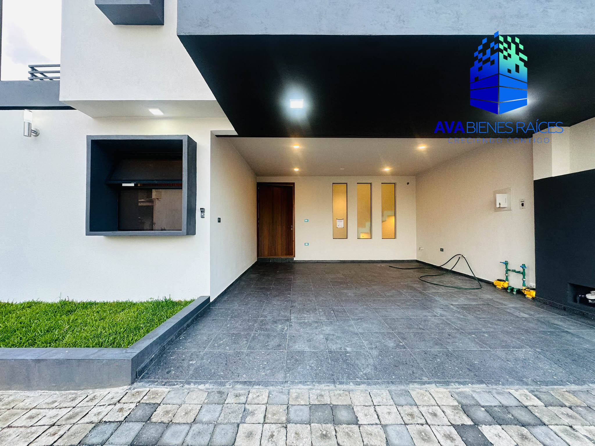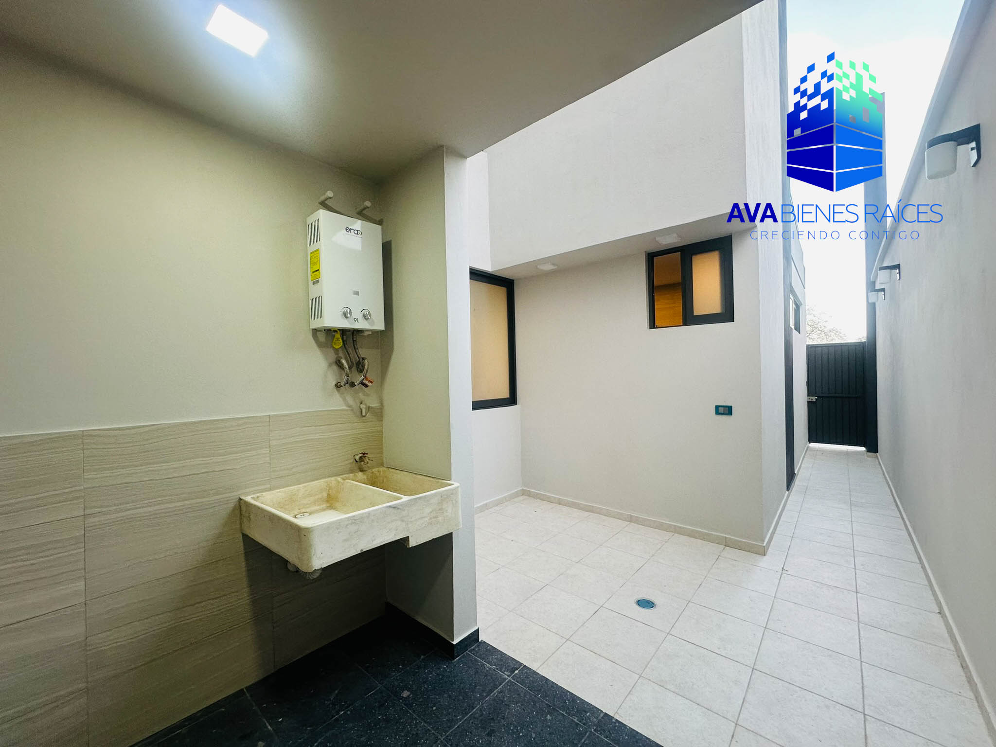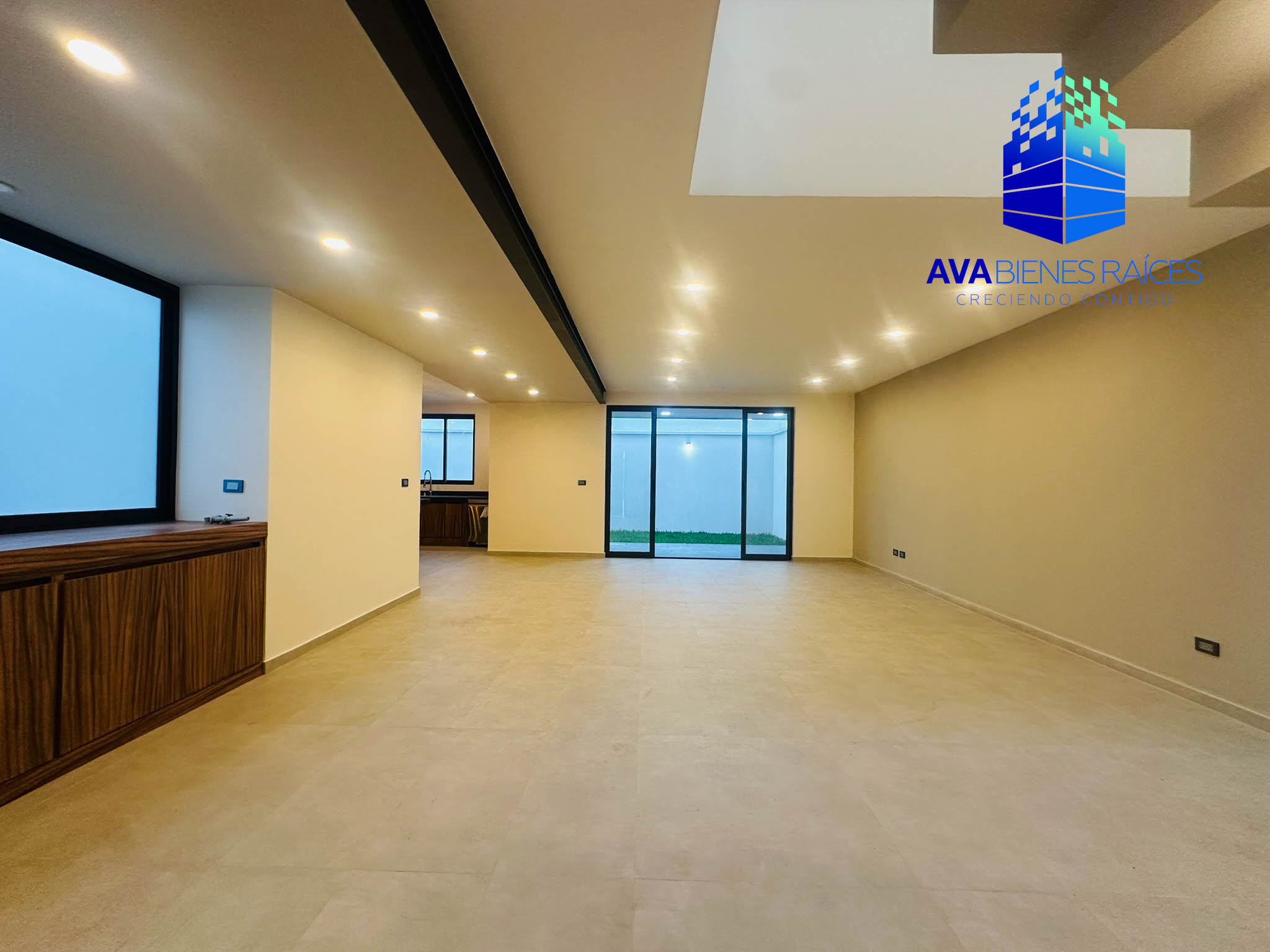 Planta baja: cochera techada para 2 autos, sala/comedor, área de guardado en sala, cocina integral con barra de granito (equipada con horno, parrila, camapana y lavavajillas), isla, alacena, área de lavado y tendido junto a cocina, pasillo de servicio de calle a cocina, un baño completo, recámara con closet, terraza y jardín.