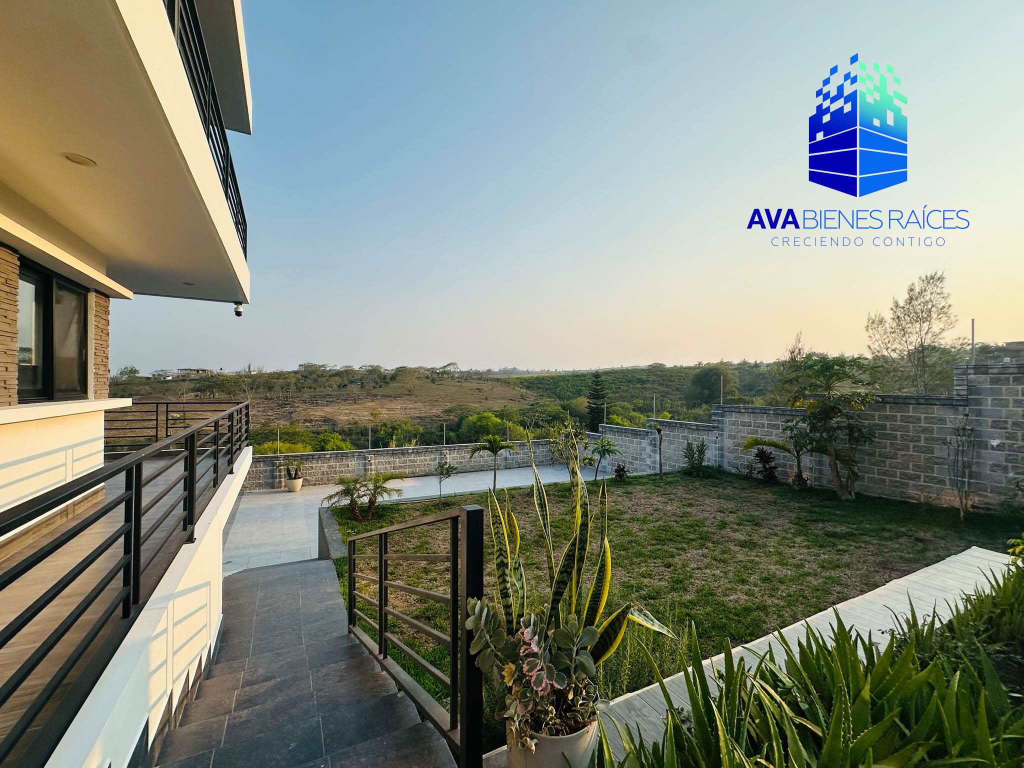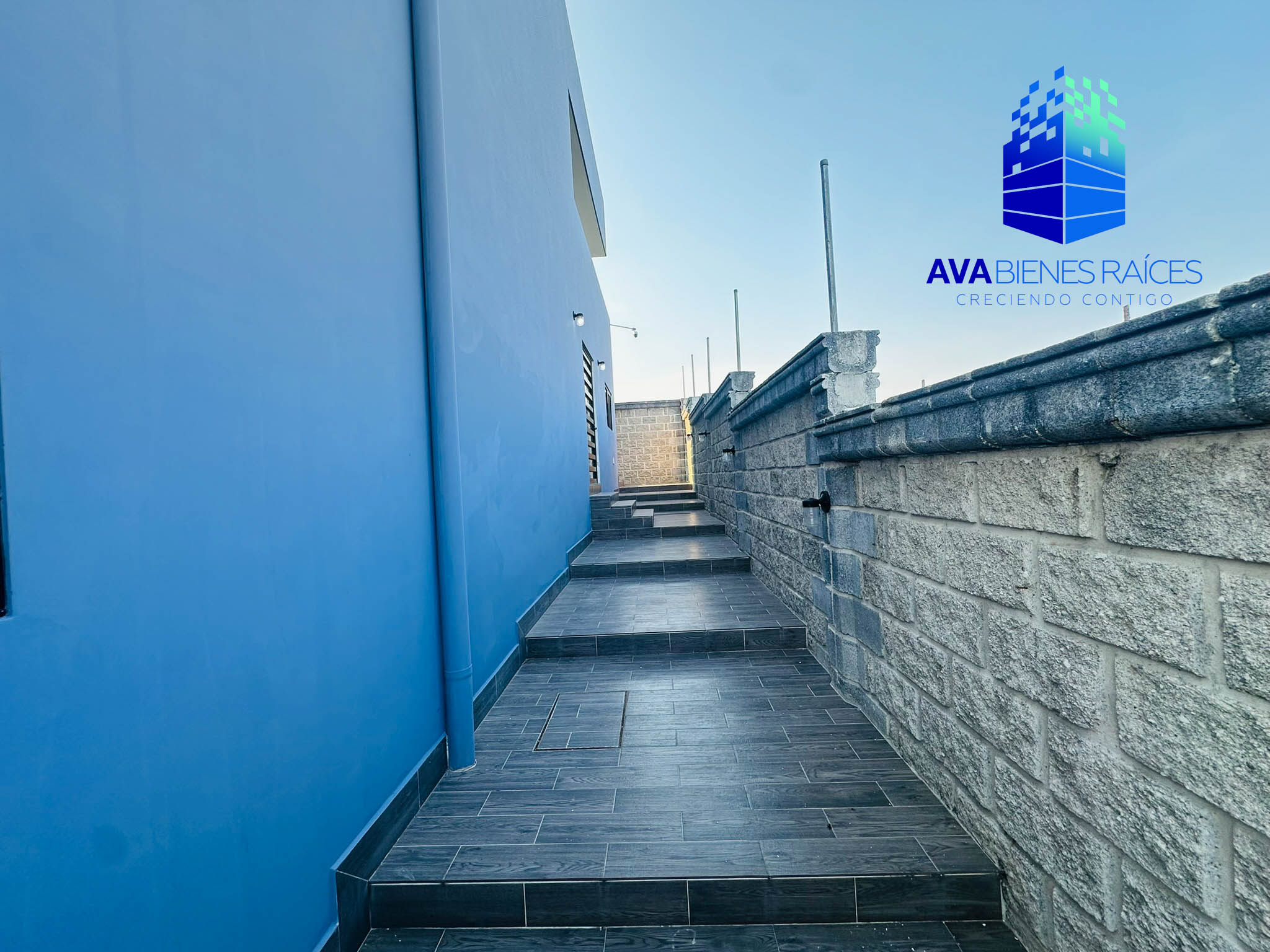 Barda escalonada, portón de aluminio, cisterna.
