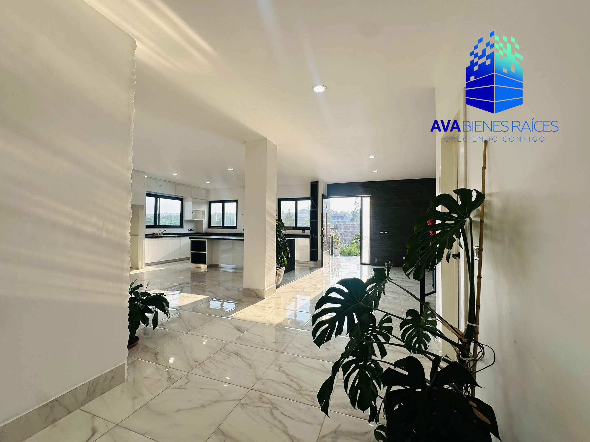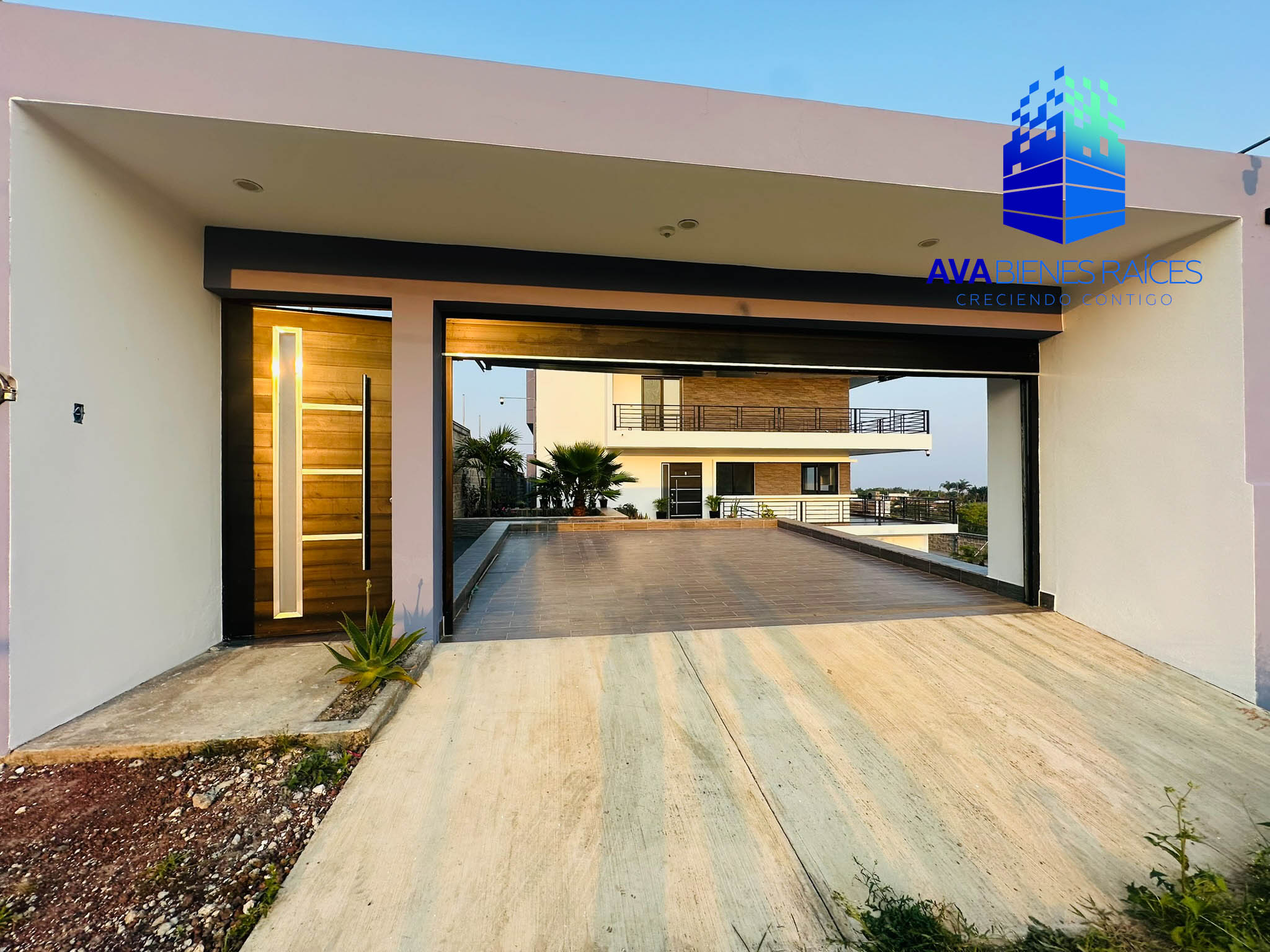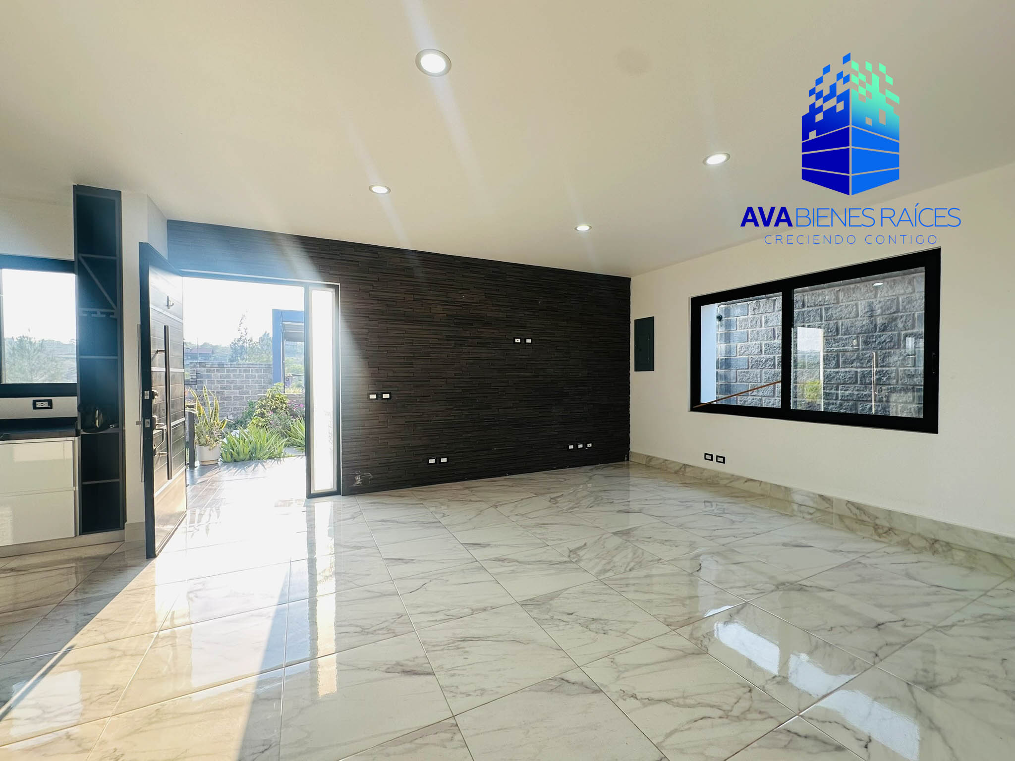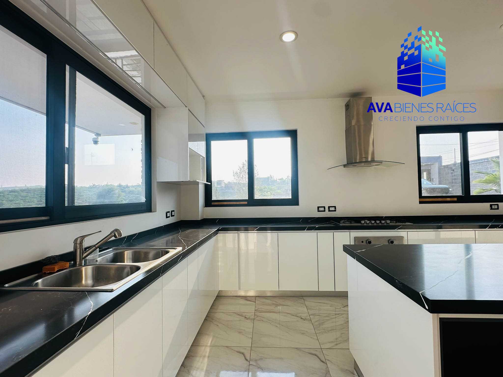 Planta baja: cochera para 2 autos con porton automatizado, jardineras, sala, comedor, cocina integral con isla, parrilla, campana, horno y doble tarja submontable, bodega, balcón, recámara con closet, un baño completo, recámara principal climatizada con espacio para vestidor, baño completo con tina, doble lavabo y regadera, área de lavado, pasillo de servicio.