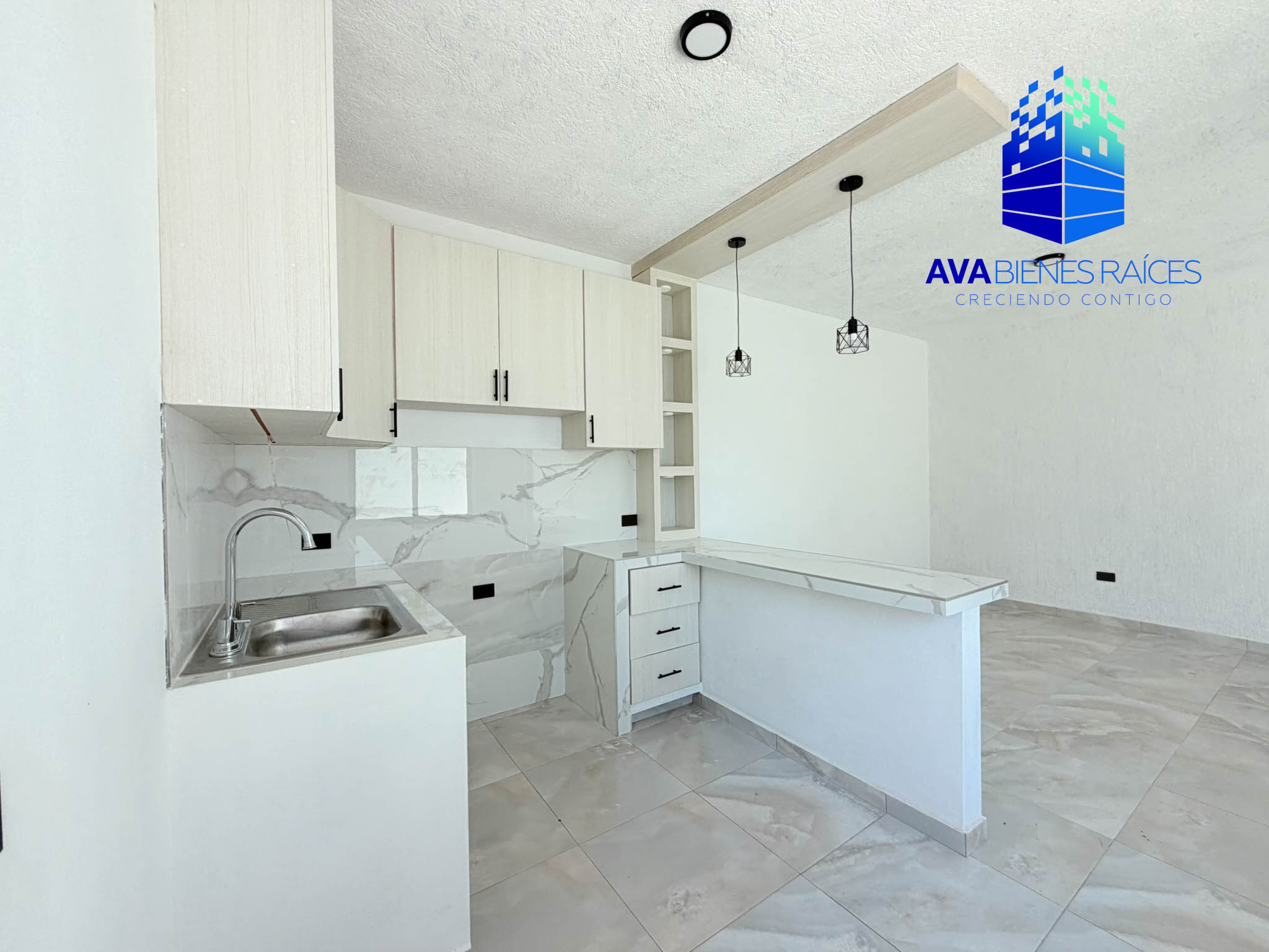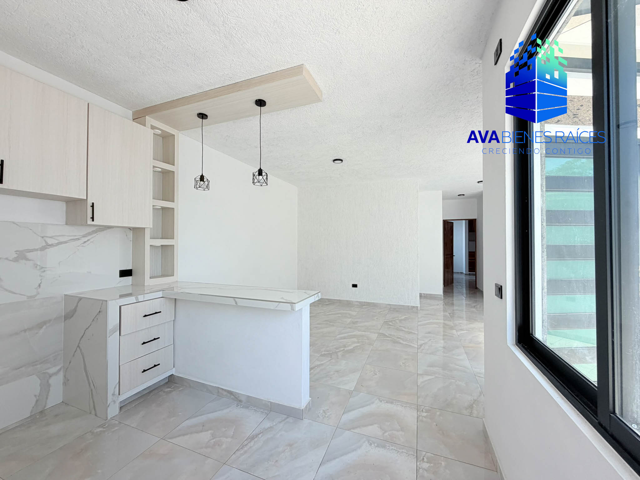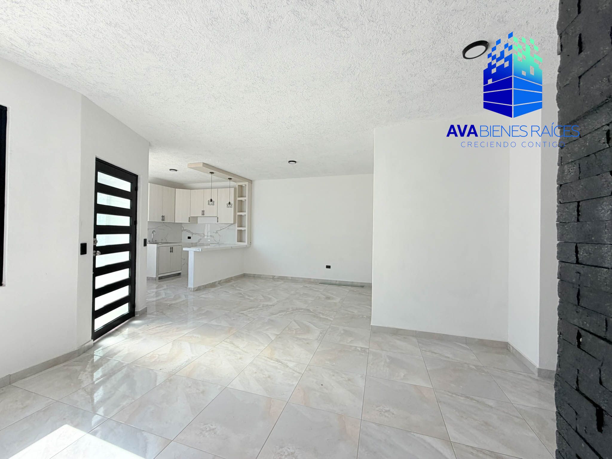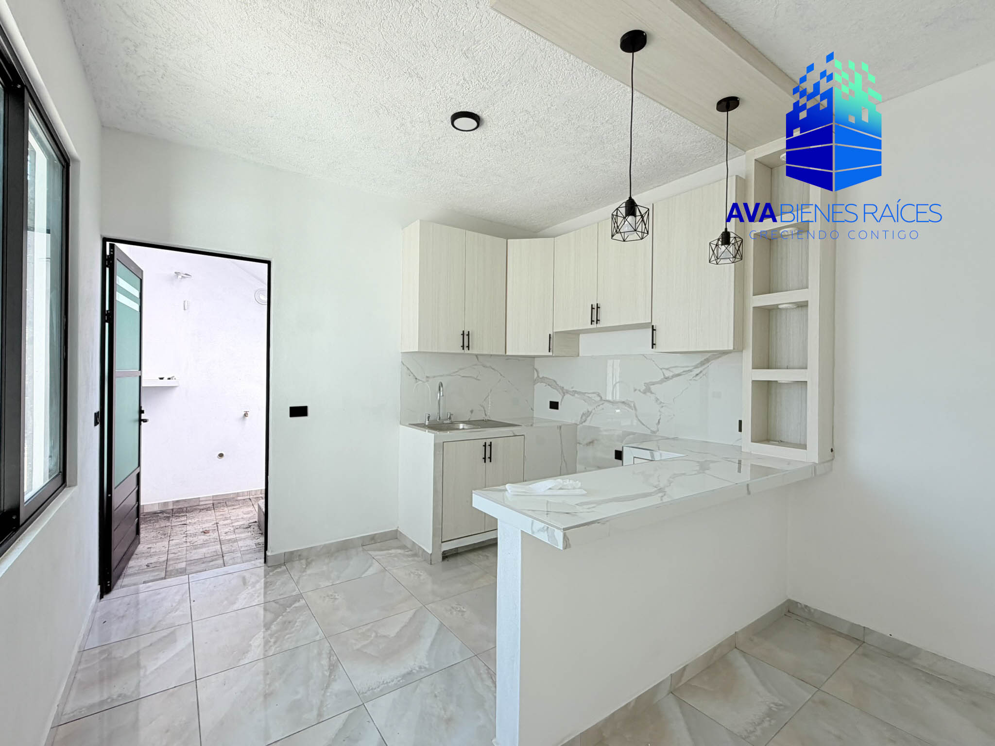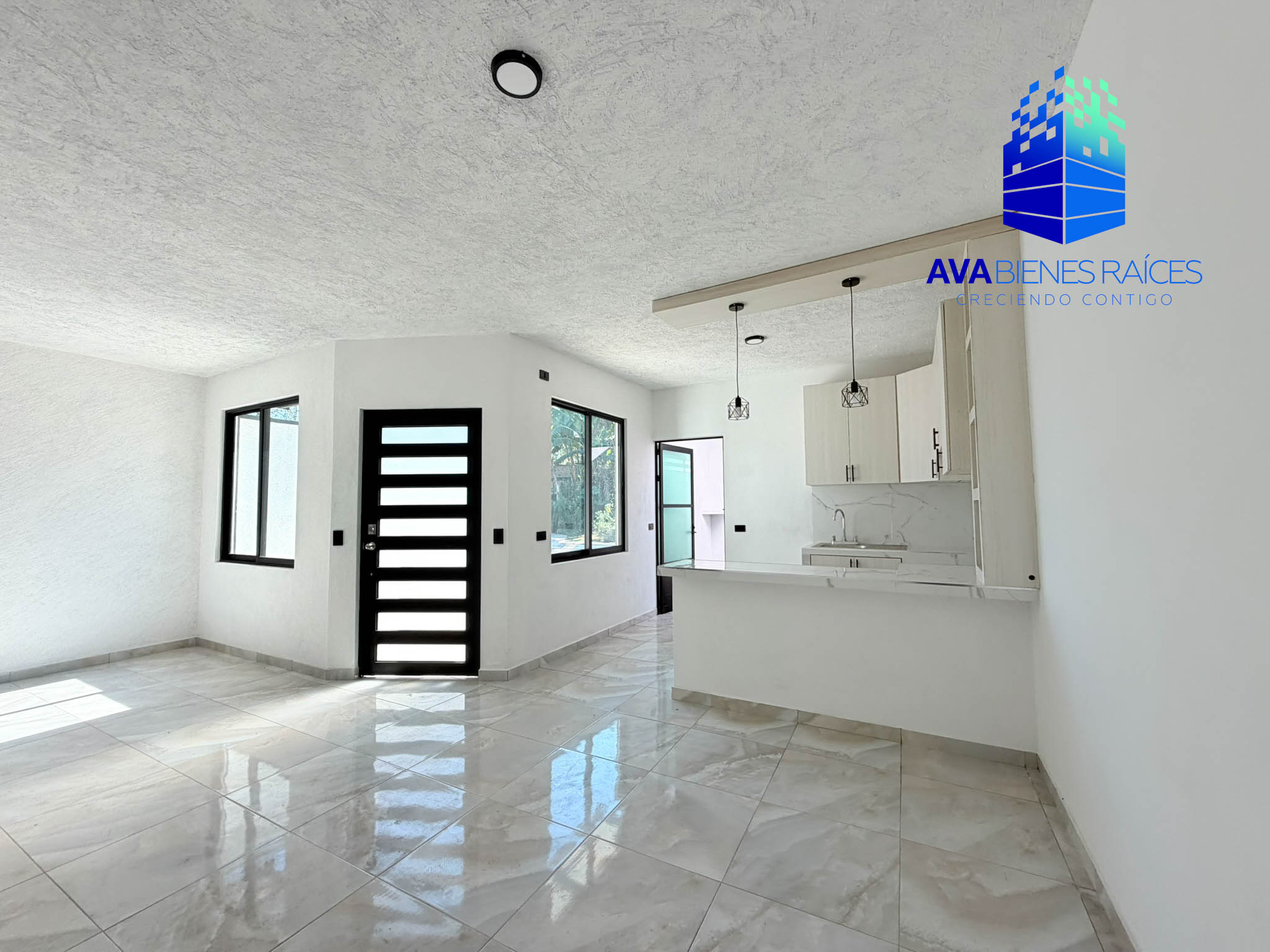 Cochera para un auto, sala/comedor, cocina integral con barra desayunador, sala/comedor, medio baño para visitas, recámara con closet y baño completo, segunda recámara con closet y baño completo, patio y acceso a azotea donde se eucentra el área de lavado y medio baño.