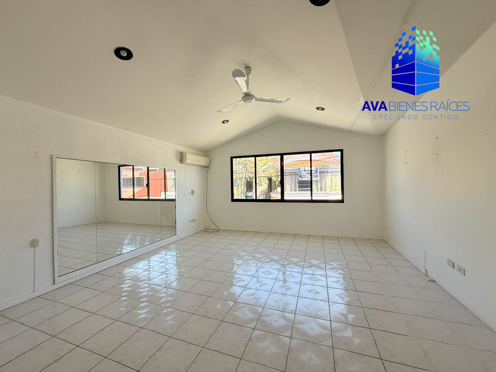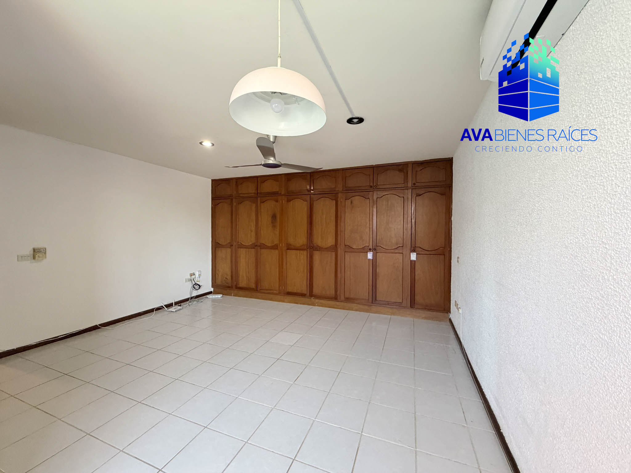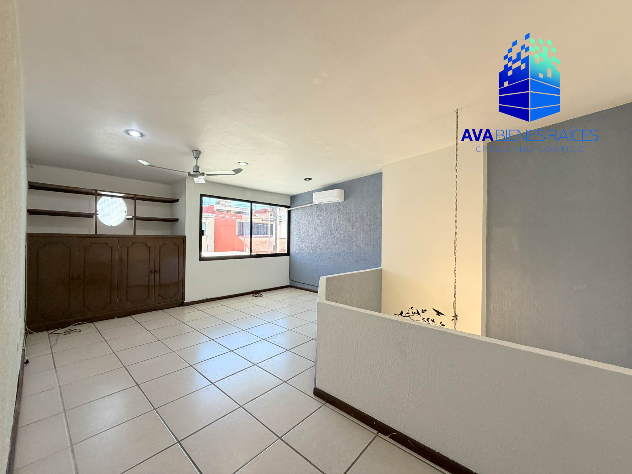 Planta alta: área de TV con clima, recámara con baño completo, recámara principal con vestidor y baño completo.