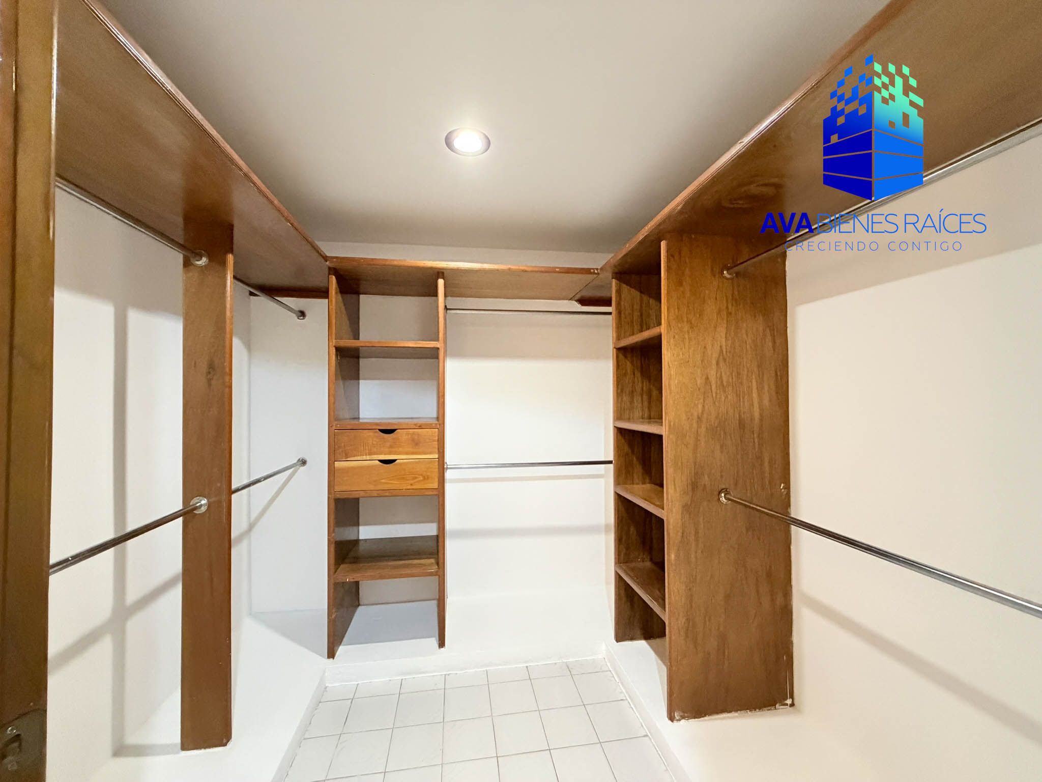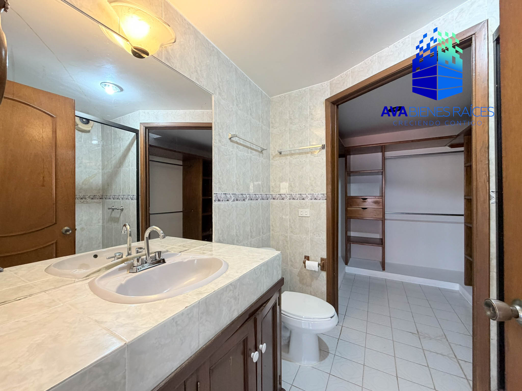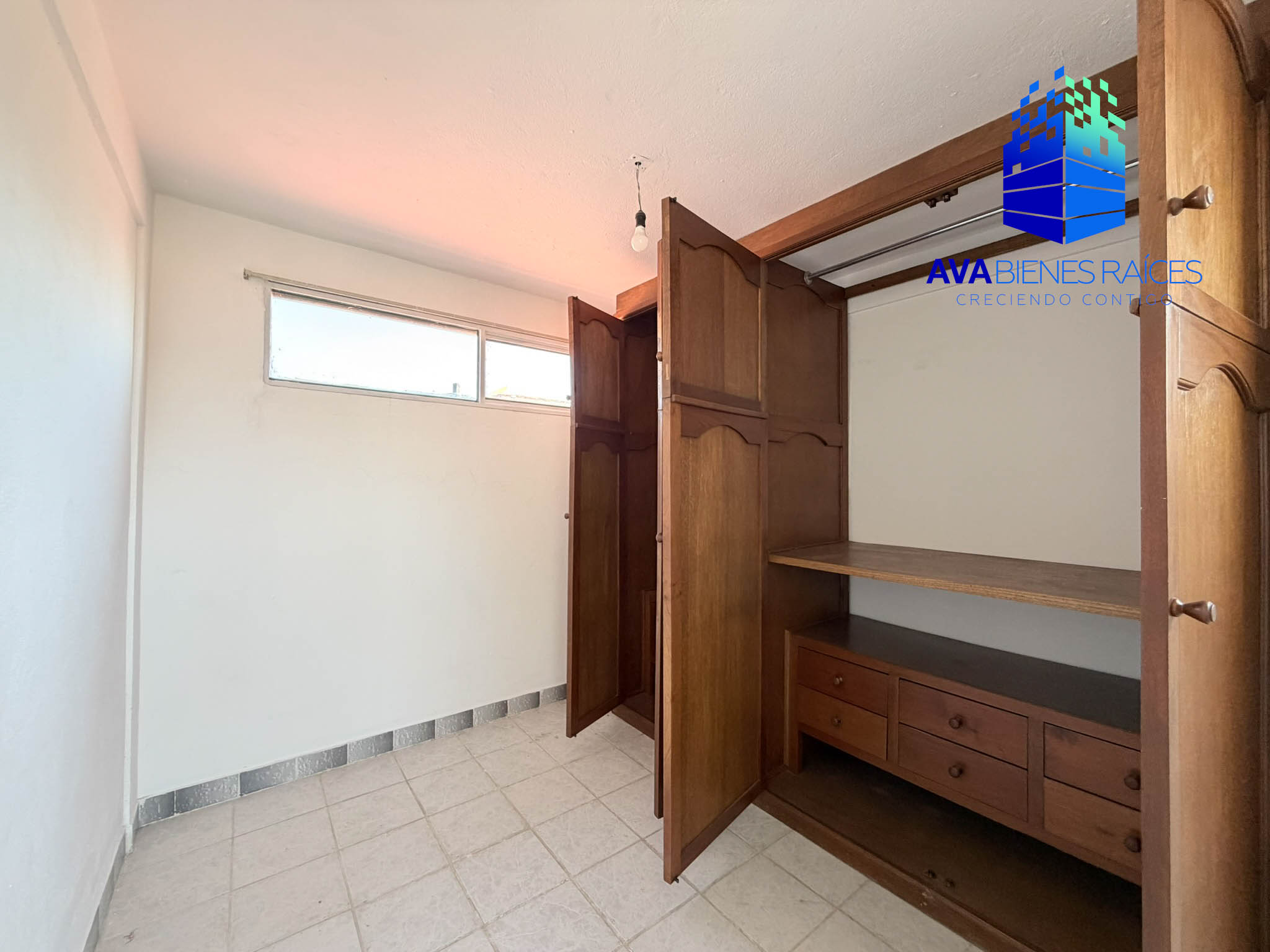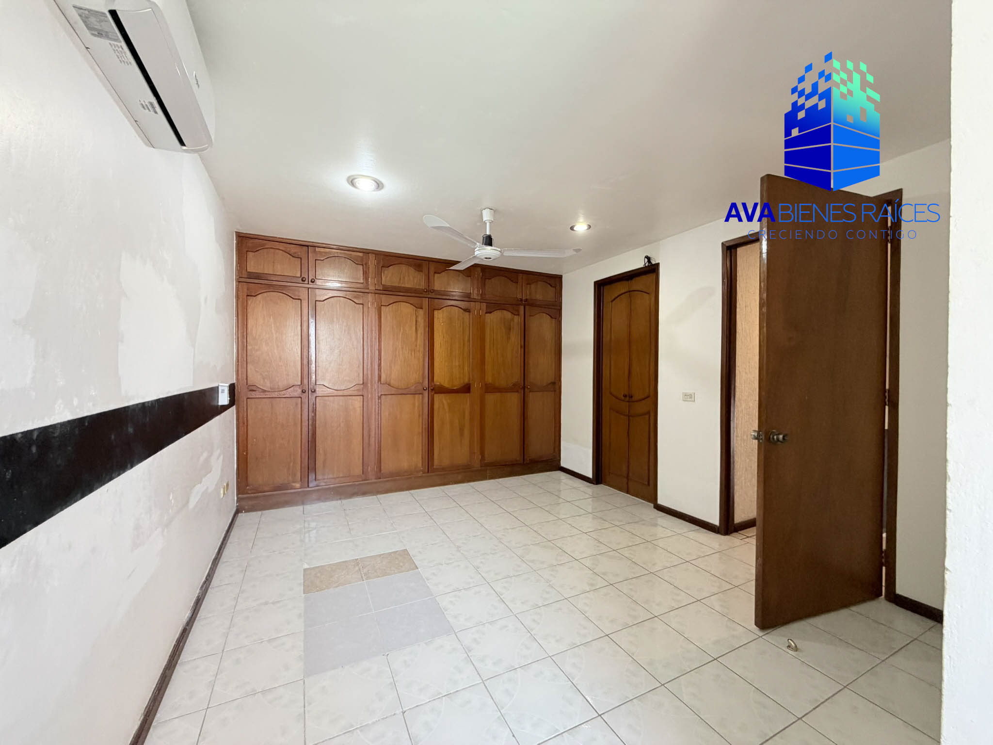 Planta alta: área de TV con clima, recámara con baño completo, recámara principal con vestidor y baño completo.